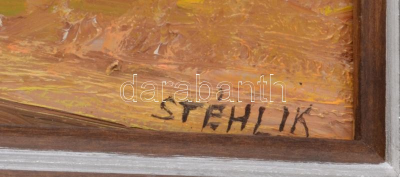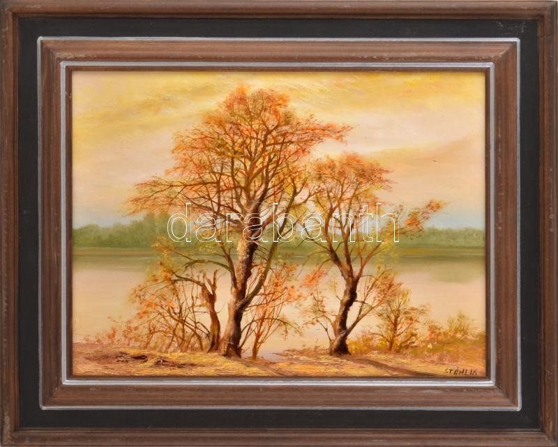Stéhlik János (1942-2021): Vályogos tó - Tiszapart. Olaj, farost, jelzett, hátoldalán autográf felirattal és címkén feliratozott. Fa keretben, 30×40 cm