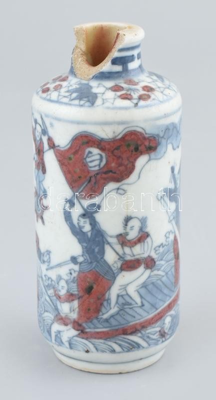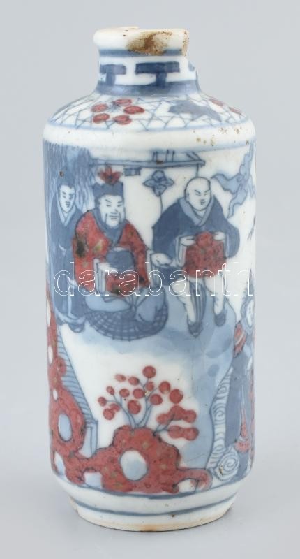 Beschreibung: Kínai tubákos szelence, porcelán, máz alatti kék festéssel, jelzett (Yung Cheng 1723-1735). Kupak nélkül, száján sérült, m: 8,5 cm