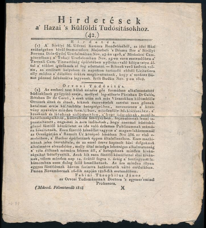 1818 Hirdetések a' Hazai 's Külföldi Tudósítások. (42.) /A M... https://www.darabanth.com/de/427-Fernauktion/427.0/Kunst-Dokumente-andere-Sammelgebiete/Drucksachen~1500003/1818-Hirdetesek-a-Hazai-s-Kulfoldi-Tudositasok-42-A-Magyar-Orszagi-Termekek-folyo-Ar~II2734628