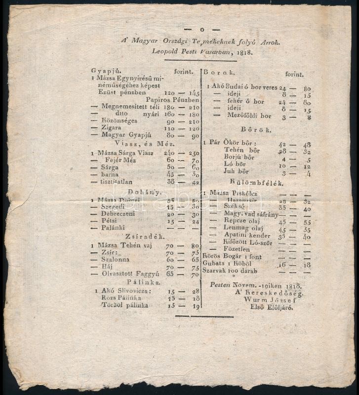 Beschreibung: 1818 Hirdetések a' Hazai 's Külföldi Tudósítások. (42.) /A Magyar Országi Termékek folyó Arrok. Leopold Pesti Vásárban, 1818.,hajtott, 2 sztl. lev.