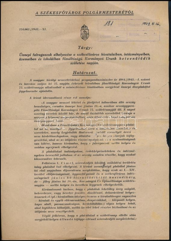 1943 Horthy. Budapest polgármesterének felhívása ünnepi falragaszok elhelyezése a Kormányzó 75. születésnapja alkalmából a város intézményeiben tárgyában 2p pecséttel jelzett.