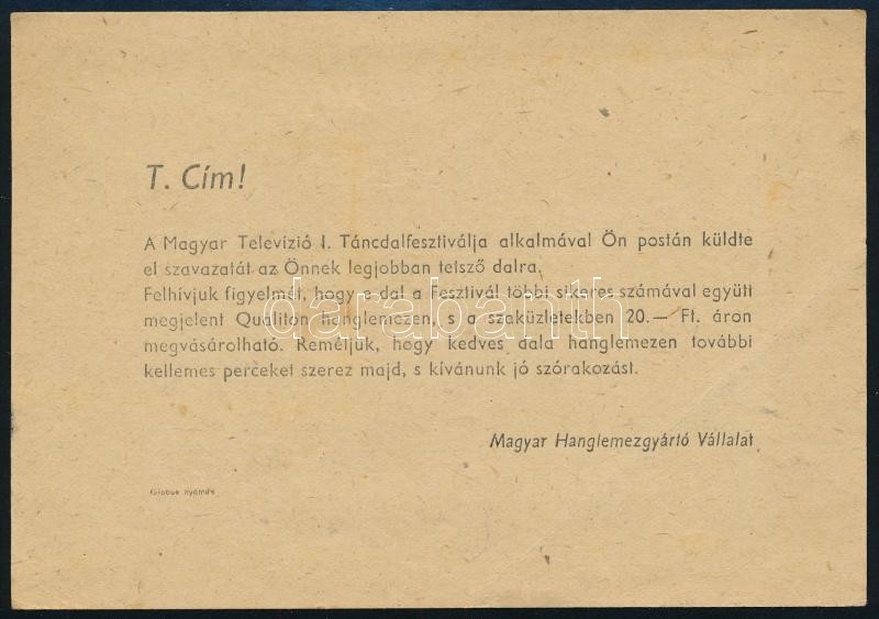 Beschreibung: 1966 Magyar Hanglemezgyártó Vállalat értesítése Táncdalfesztivál szavazat ügyében