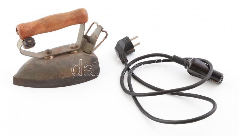Régi villanyvasaló, masszív fém, fa fogóval, XX. sz. közepe körül, jelzett, korának megfelelő állapotban, működőképes (nem kipróbált), hozzá való csatlakozóval, 18,5x9x13,5 cm