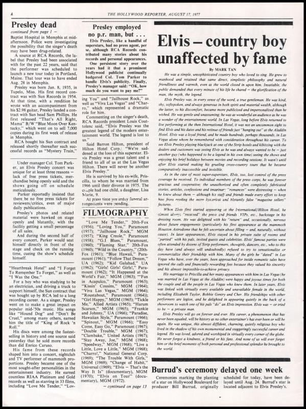 1977 The Hollywood Reporter, Vol. CCXLVII, No. 44. August 17, 1977. El... https://www.darabanth.com/de/427-Fernauktion/427.0/Kunst-Dokumente-andere-Sammelgebiete/Musik-Noten-Instrumenten~1500002/1977-The-Hollywood-Reporter-Vol-CCXLVII-No-44-August-17-1977-Elvis-Presley-1935-1977-14-p-~II2729757