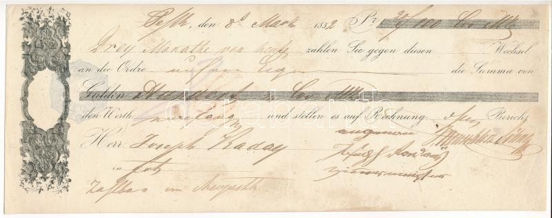 Beschreibung: Pest (Budapest) 1852. Kitöltött váltó 100Ft-ról (?), hátoldalon 6kr illeték bélyegzéssel T:II