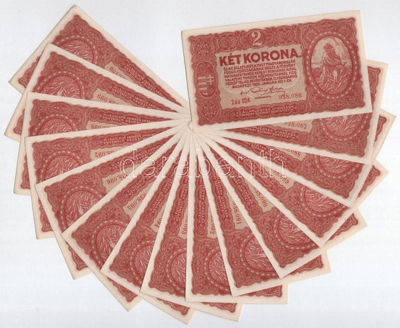 1920. 2K (15x) sorszámkövetők "2aa 024 938.086 - 2aa 024 938.100&... https://www.darabanth.com/de/427-Fernauktion/427.0/Numismatik/Ungarische-Banknoten~2000007/1920-2K-15x-sorszamkovetok-2aa-024-938086-2aa-024-938100-TI-II-Adamo-K7~II2730888