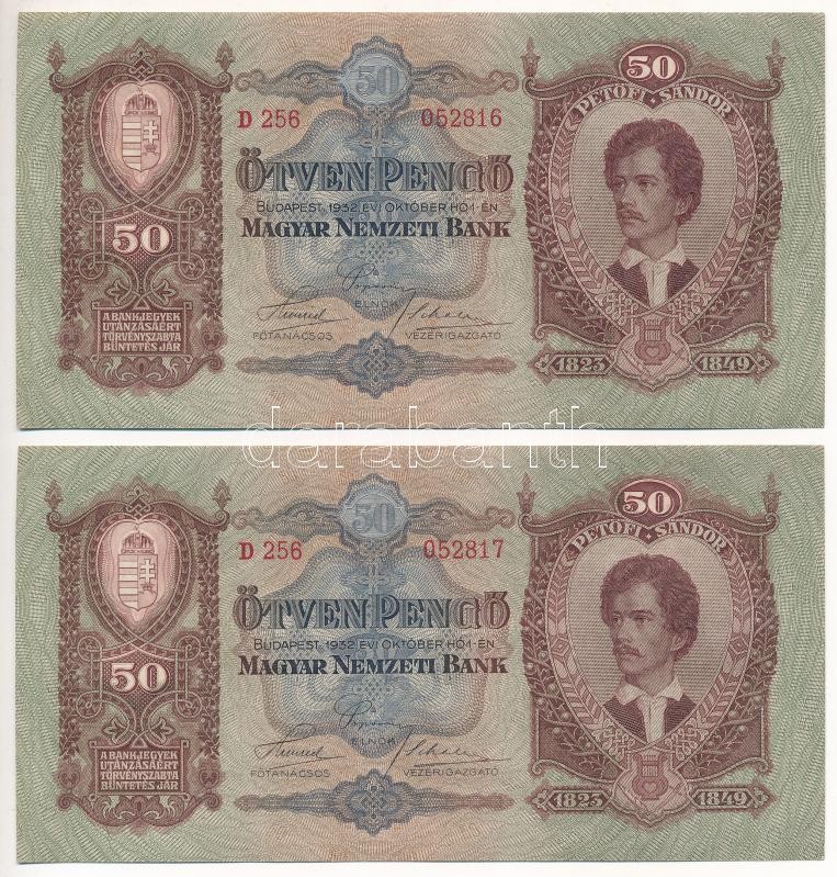 1932. 50P (2x) sorszámkövetők "D 256 052816 - D 256 052817",... https://www.darabanth.com/de/427-Fernauktion/427.0/Numismatik/Ungarische-Banknoten~2000007/1932-50P-2x-sorszamkovetok-D-256-052816-D-256-052817-nyomdai-papirrancokkal-TI--Adam~II2730920