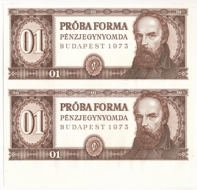 Beschreibung: 1973. Táncsics 01 "PRÓBA FORMA" bankjegy terv barna előoldali nyomattal, üres hátlappal, 2db-os ívben T:I- kissé hullámos papír