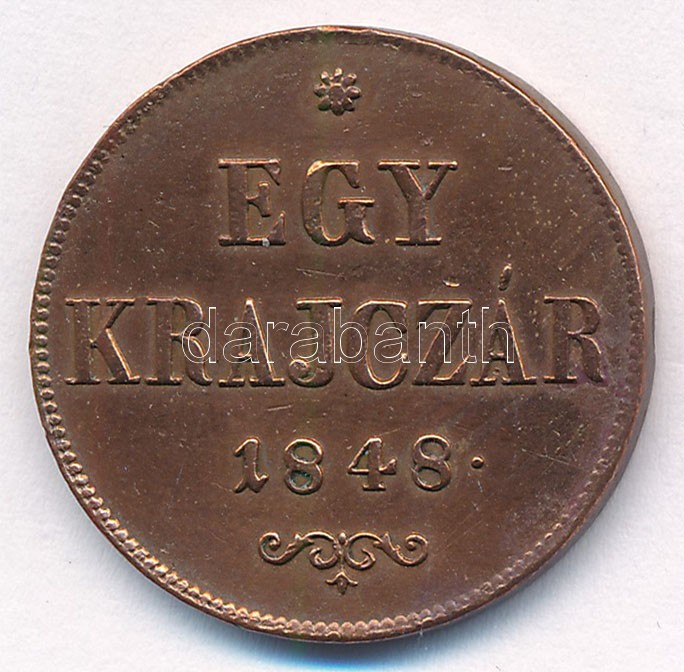 Adamo B1 https://www.darabanth.com/de/427-Fernauktion/427.0/Numismatik/Ungarische-Munzen-und-Munzen-mit-ungarischem-Munzzeichen~2000008/1848-1kr-Cu-T1-patina-ph--Adamo-B1~II2724701
