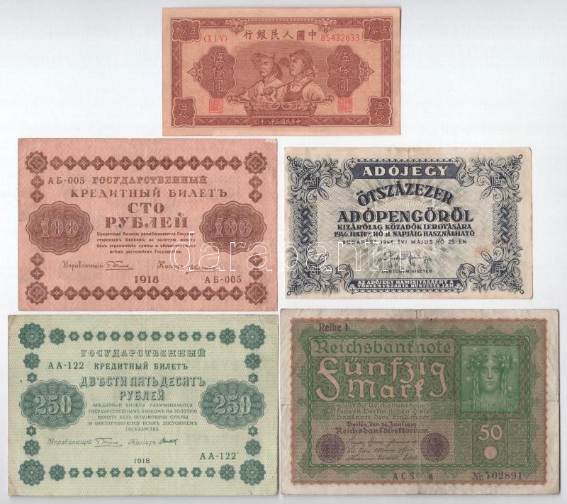 Beschreibung: Kínai Köztársaság 1949. 50Y + Orosz Birodalom 1918. 100R + 250R + Magyarország 1946. 500.000AP + Németország 1919. 50M T:II-III