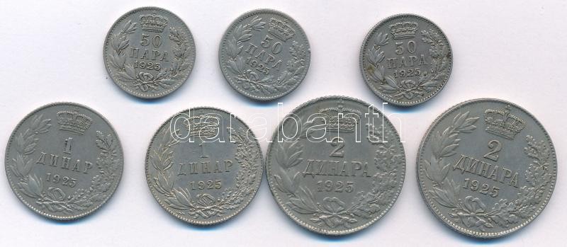Szerb-Horvát-Szlovén Királyság 1925. 50p Cu-Ni "I. Sándor" (3x) + 1D Cu-Ni "I. Sándor" (2x) + 2D Cu-Ni "I. Sándor" (2x) T:2,2- Kingdom of the Serbs, Croats and Slovenes 1925. 50 Para Cu-Ni "Alexandar I" (3x) + 1 Dinar Cu-Ni "Alexandar I" (2x) + 2 Dinara Cu-Ni "Alexandar I" (2x) C:XF,VF Krause KM#4, KM#5, KM#6