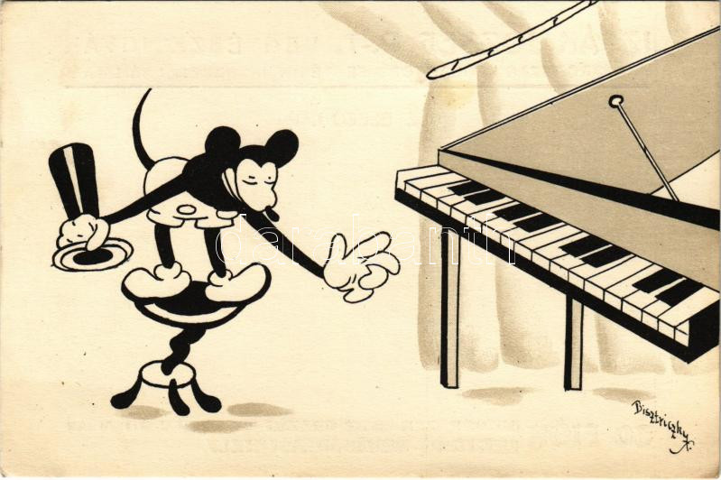 Mickey egér meghajol zongorázás után. Klösz korai Disney képeslap. Hátoldalon Izsák József R.-T. Vegyészeti gyár reklámja / Mickey Mouse takes a bow after playing the piano. Early Hungarian Disney postcard s: Bisztriczky