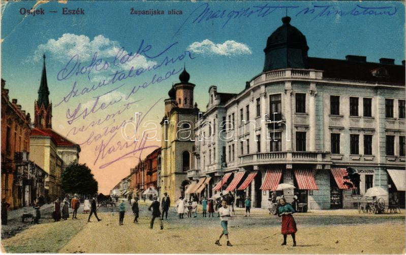 1918 Eszék, Essegg, Osijek; Zupanijska ulica, Lekárna / utca, gyógysze... https://www.darabanth.com/de/428-Fernauktion/428.0/Ansichtskarten/Kroatien~1500007/1918-Eszek-Essegg-Osijek-Zupanijska-ulica-Lekarna-utca-gyogyszertar-zsinagoga-Vasuti-~II2743977