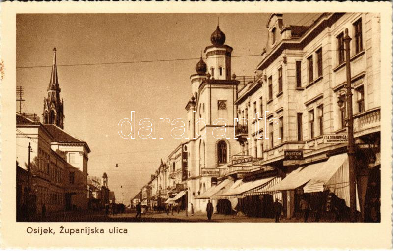 Eszék, Essegg, Osijek; Zupanijska ulica, Ljekarna, Vukovar 36, Boston, Armin Bruckner, Buchler. Naklada Milan Dirnbach / utca, üzletek, gyógyszertár / street, shops, pharmacy