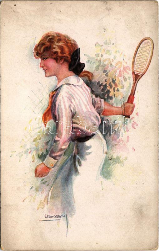 1919 Tenisz hölgy / Tennis lady. Erkal No. 336/4. s: Usabal (EK) https://www.darabanth.com/de/428-Fernauktion/428.0/Ansichtskarten/Kunstlerkarten~1500037/1919-Tenisz-holgy-Tennis-lady-Erkal-No-3364-s-Usabal-EK~II2744101