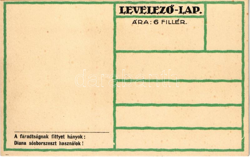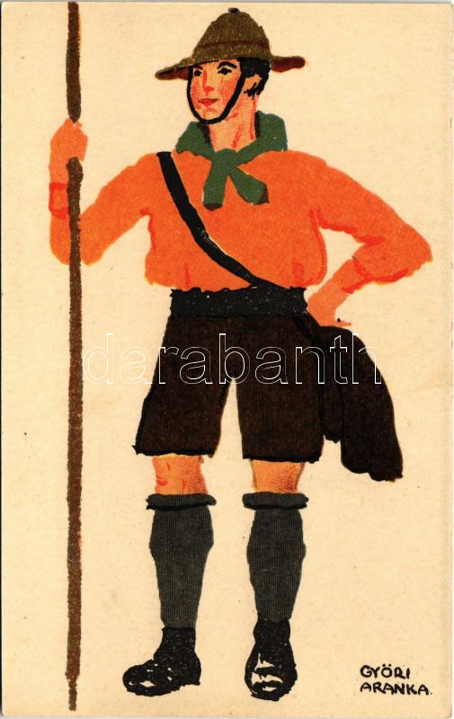 Cserkész művészlap. A fáradtságnak fittyet hányok: Diana sósborszeszt használok! / Hungarian boy scout art postcard. Advertisement on the backside s: Győri Aranka