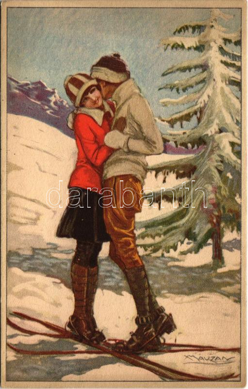 Beschreibung: Olasz művészlap síelő szerelmespárral / Italian art postcard, skiing couple in winter, sport. 276-1. s: Mauzan