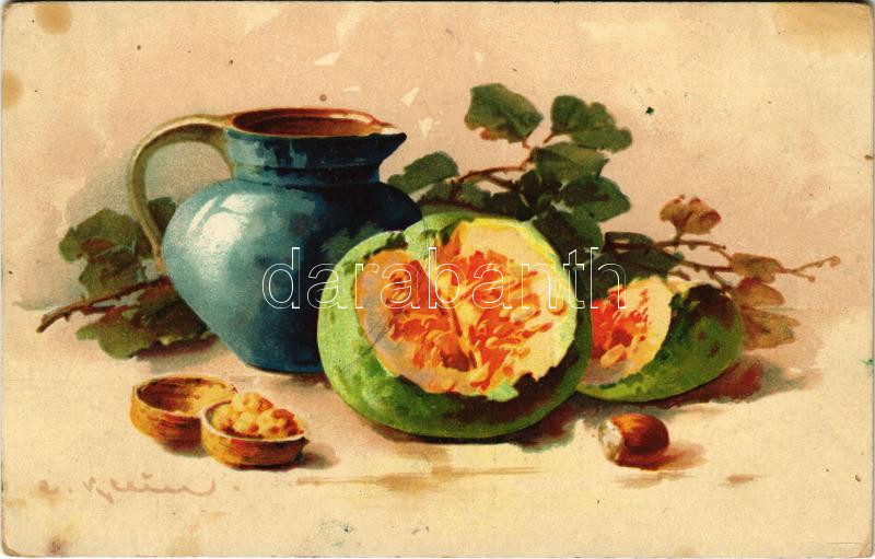 Still life art postcard with cantaloupe s: C. Klein (fl) https://www.darabanth.com/de/428-Fernauktion/428.0/Ansichtskarten/Kunstlerkarten~1500037/Still-life-art-postcard-with-cantaloupe-s-C-Klein-fl~II2738287