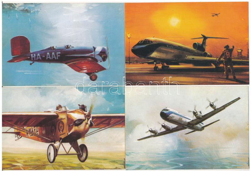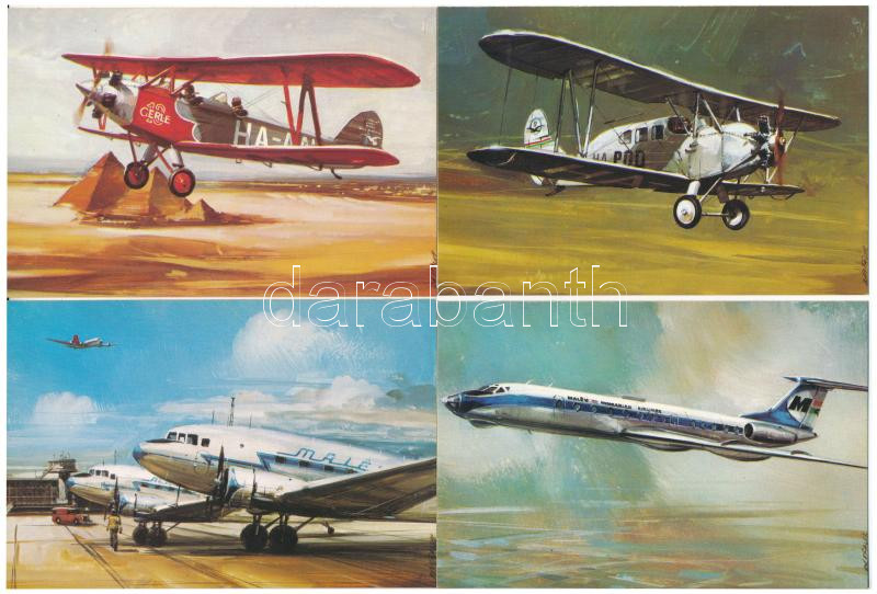12 db MODERN motívum képeslap: MALÉV (Magyar Légiközlekedés Vállalat) repülőgépek, Bánfalvy Ákos szignóval / 12 modern motive postcards: Hungarian Airline's aircrafts, signed by Ákos Bánfalvy