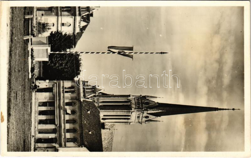 Beschreibung: Muraszombat, Murska Sobota; Országzászló, templom, Siftár Károly üzlete / Hungarian flag, church, shop (fl)