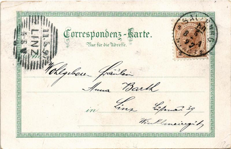 Beschreibung: 1897 (Vorläufer!) Salzburg, Gruss aus der Stiftskellerei. Haydn Stübel. Regel & Krug Art Nouveau, floral, litho (EK)