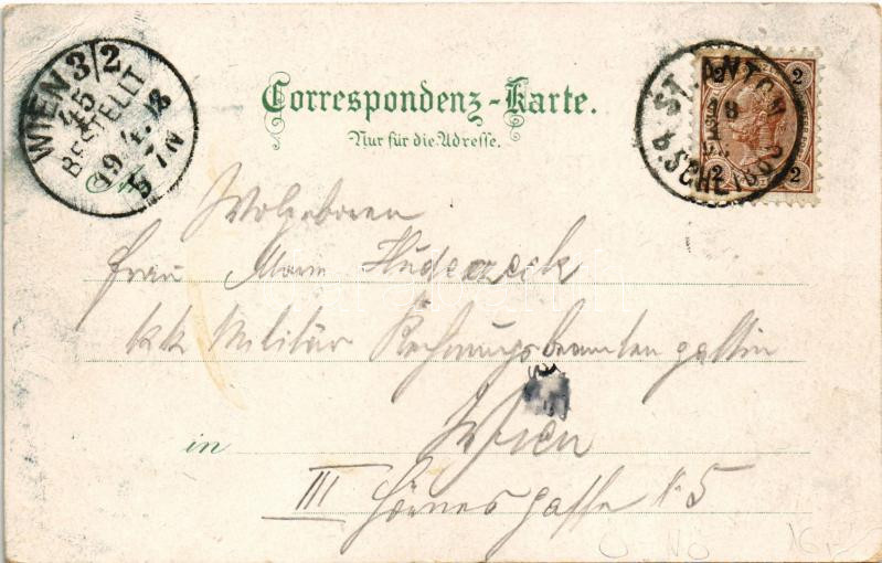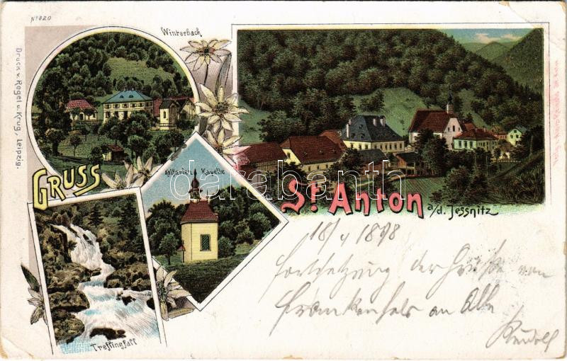 Beschreibung: 1898 (Vorläufer) Sankt Anton an der Jessnitz, Winterbach, Kapelle, Treffingfall. Regel & Krug Art Nouveau, floral, litho (EK)