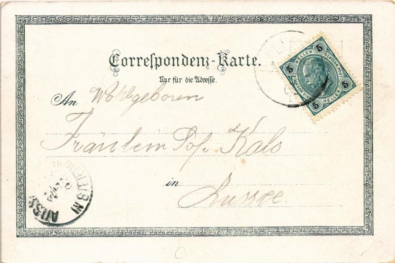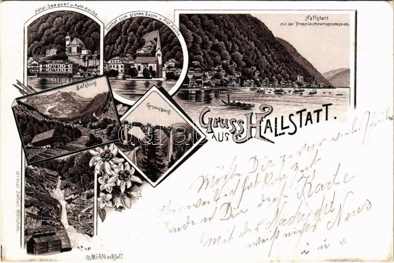 1902 Hallstatt, Hotel Seeauer u. kath. Kirche, Gasthof zum grünen Baum u. Prot. Kirche, Gosauzwang, Salzberg, Mühlbachfall, Hallstatt mit der Frohnleichnamsprozession. Ottmar Zieher Art Nouveau, floral, litho (EK)