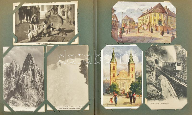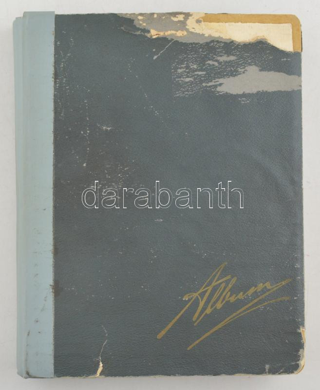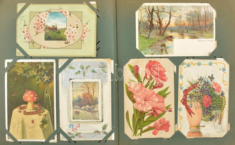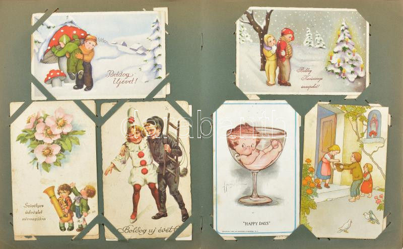 Kb. 162 db RÉGI képeslap régi albumban, vegyes minőségben: sok litho, sorozatok, párok, szecessziós és Art Deco lapok (Bompard, Nanni), szignósak és szignótlanok, művészlapok, malmok, üdvözlők, városok, tájak, hölgyek, gyerekek, humor / Cca. 162 pre-1945 postcards in an old album, mixed quality: artist signed, lady, children, humour, town-views, Italian art postcards, Art Nouveau, mills, greetings