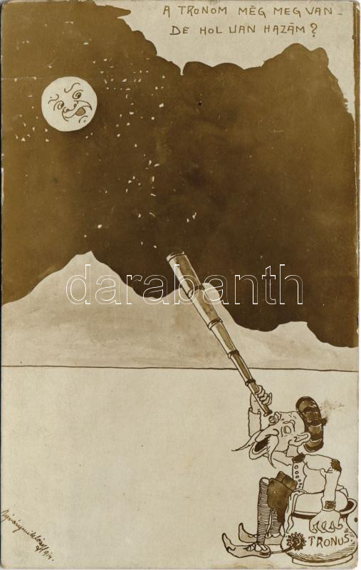 1914 A trónom még megvan - de hol van hazám? I. Péter szerb király humoros karikatúra, szerbellenes propaganda / WWI Austro-Hungarian K.u.K. military art postcard, humorous anti-Serbian military mocking propaganda caricature of King Peter I of Serbia s: Újváry Miklós (?) (EK)