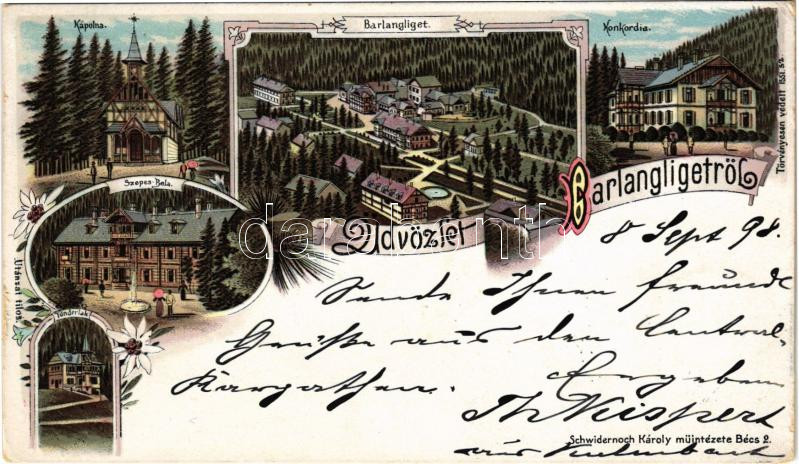 1898 (Vorläufer) Barlangliget, Höhlenhain, Tatranská Kotlina (Tátra, Magas Tátra, Vysoké Tatry); Kápolna, Barlangliget, Konkordia, Szepes-Béla, Tündérlak nyaraló. Schwidernoch Károly műintézete / chapel, hotel, villas. Art Nouveau, floral, litho (EK)