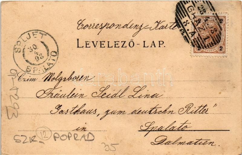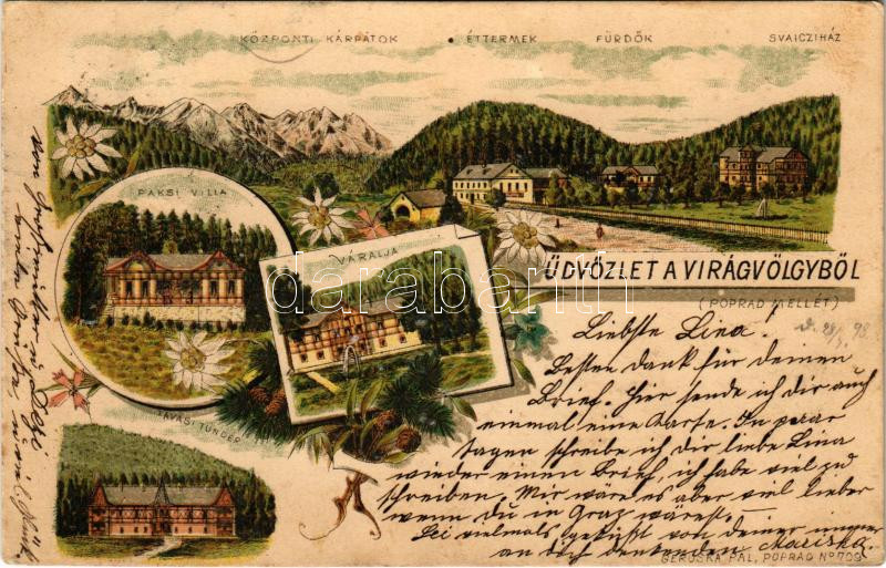 1898 (Vorläufer) Tátra, Tatry; Rózsavölgy (Virágvölgy), Blumental, Kvetnica; Központi Kárpátok, Éttermek, Fürdők, Svájci ház, Paksi villa, Váralja, Havasi Tündér nyaraló. Geruska Pál kiadása / spa, restaurants, baths, villas. Art Nouveau, floral, litho (EK)