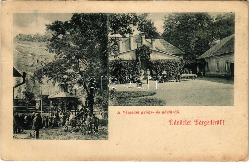 1900 Várgede, Várgedefürdő, Kúpele Hodejov, Hodejov; Gyógy- és gőzfürdő, Csevicze kút, vonat a háttérben / spa, steam bath, well, spring source, train in the background (Rb)