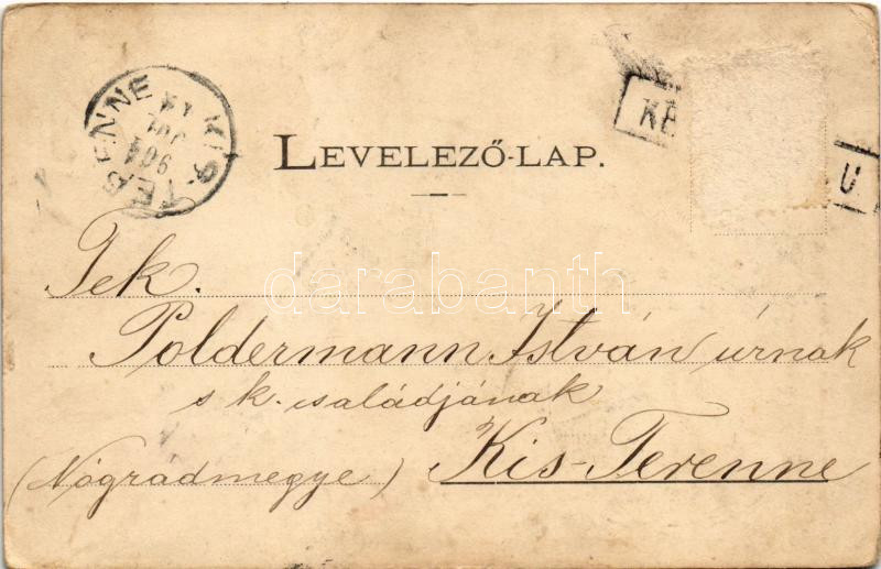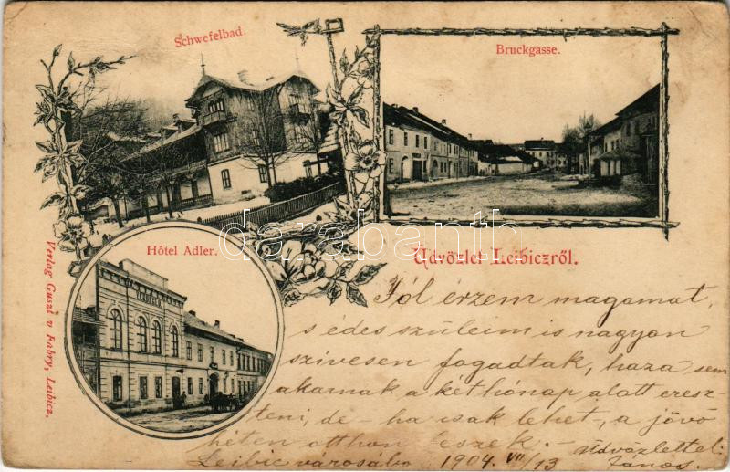 1904 Leibic, Leibicz, Leibitz, Lubica; Híd utca, Kénfürdő télen, Sas szálloda. Fábry Gusztáv kiadása / Brückgasse, Schwefelbad, Hotel Adler / street view, hotel, sulfur spa, bath in winter. Art Nouveau, floral (Rb)