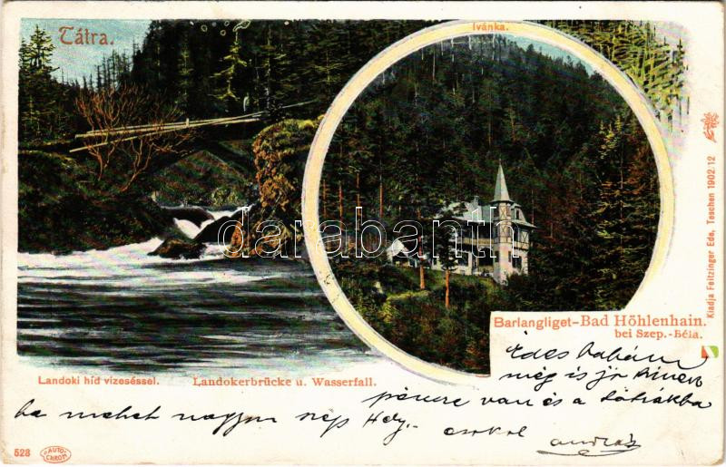 1905 Barlangliget, Höhlenhain, Tatranská Kotlina (Tátra, Magas Tátra, Vysoké Tatry); Landoki híd vízeséssel, Ivánka nyaraló. Feitzinger Ede 1902/12. 528. Auto-Chrom / Landokerbrücke u. Wasserfall / wooden bridge by Lendak, villa (EK)