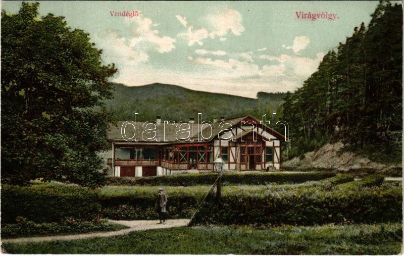 Beschreibung: 1909 Tátra, Tatry; Virágvölgy (Rózsavölgy), Blumental, Kvetnica; Vendéglő. Divald Károly műintézete 2143-1909. / restaurant (EK)