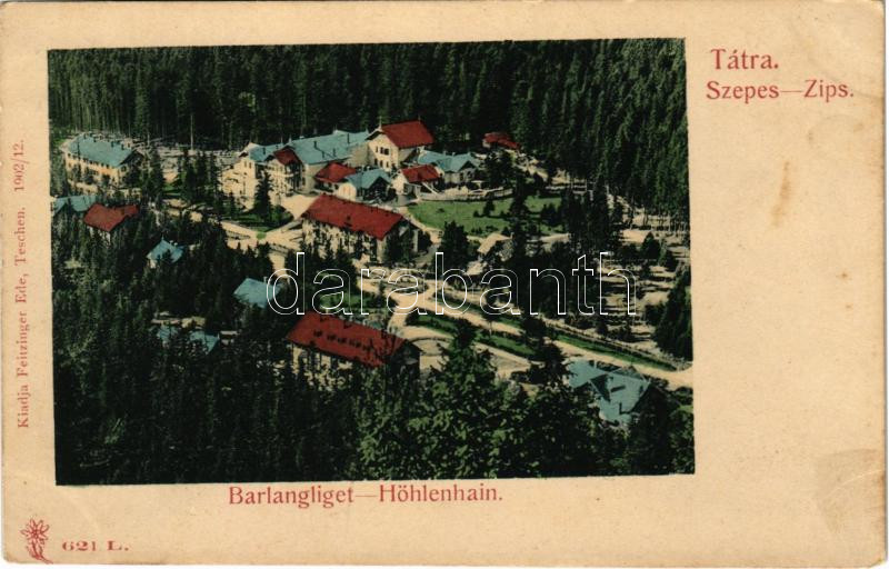 Beschreibung: Barlangliget, Höhlenhain, Tatranská Kotlina (Tátra, Magas Tátra, Vysoké Tatry); látkép. Feitzinger Ede 1902/12. 621L. / general view (fl)