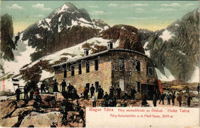 Tátra, Magas Tátra, Vysoké Tatry; Téry menedékház az Öt-tónál, turisták. Franz Pietschmann No. 3076. / Téry-Schutzhütte a. d. Fünf-Seen / chalet, tourist house (EK)