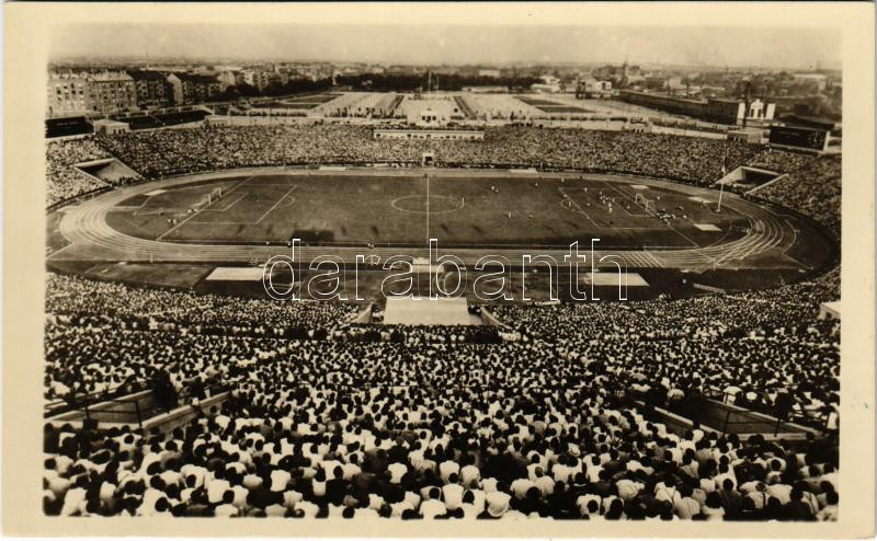 Budapest XIV. Népstadion, labdarúgó mérkőzés, foci. Képzőművészeti Alap kiadóvállalat + "Osztrák-Magyar 100. labdarúgó mérkőzés 1955. X. 16." So. Stpl.