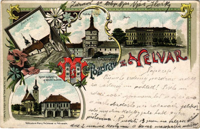 1901 Velvary, Stará fortna, Prazská brána, Skola, Kostel sv. Kateriny a soudní budova / castle, school, gate, church, coat of arms. Lit. Th. Böhm Art Nouveau, litho (EK)