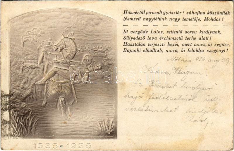 1526-1926 Mohácsi vész 400. évfordulójának dombornyomott emléklapja. A mohácsi síkon építendő Fogadalmi templom alapja javára. Kiss Gy. domborműve. Szeiler vésnök / 400th anniversary of the Battle of Mohács, charity card Emb. + "Mohácsi vész évforduló 1526-1926 "Lajos, Lajos! Iffiju szép királ, magyar csillag ékes virágszál"" So. Stpl. (EK)