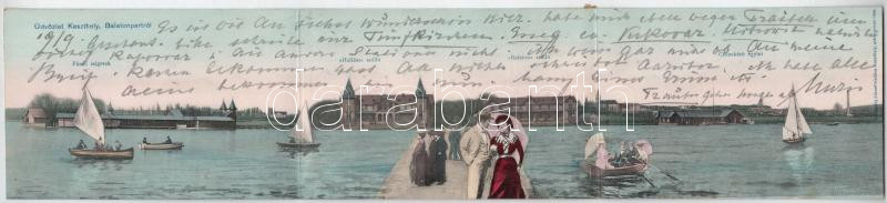 Beschreibung: 1905 Keszthely, Balaton-part, Fürdőszigetek, Hullám szálló, Balaton szálloda, Csónakázó egylet. Sujánszky József kiadása. 3-részes kihajtható panorámalap. Montázs urakkal és hölgyekkel / 3-tiled folding panoramacard. Montage with ladies and gentlemen
