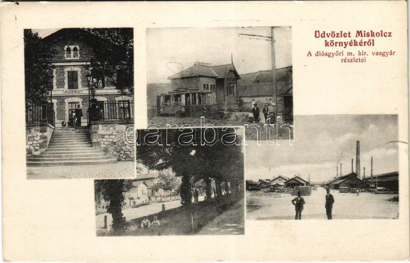 Beschreibung: 1913 Diósgyőr (Miskolc), M. kir. vasgyár részletei, villamos megállóhely, villa. Grünwald Ignác kiadása (EK)