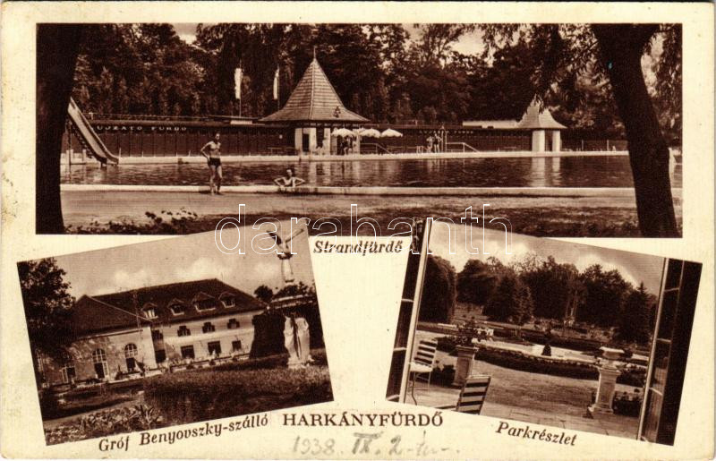 1938 Harkányfürdő, Strandfürdő, Gróf Benyovszky szálló, park (EK) https://www.darabanth.com/de/428-Fernauktion/428.0/Ansichtskarten/Ungarn~1500003/1938-Harkanyfurdo-Strandfurdo-Grof-Benyovszky-szallo-park-EK~II2737302