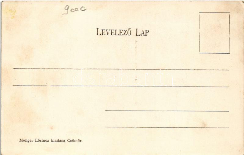 Beschreibung: Csömör, Községháza, Posta, Monger Lőrinc üzlete és saját kiadása (fl)