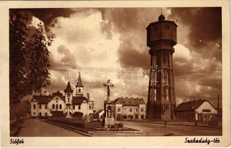 Siófok, Szabadság tér, víztorony https://www.darabanth.com/de/428-Fernauktion/428.0/Ansichtskarten/Ungarn~1500003/Siofok-Szabadsag-ter-viztorony~II2649630