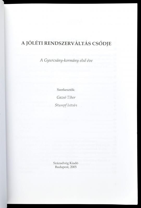 A jóléti rendszerváltás csődje. A Gyurcsány-kormány első éve. Szerk.: Gazsó Tibor, Stumpf István. Bp., 2005., Századvég. Kiadói papírkötés, a borító egyik sarkán szamárfüllel.