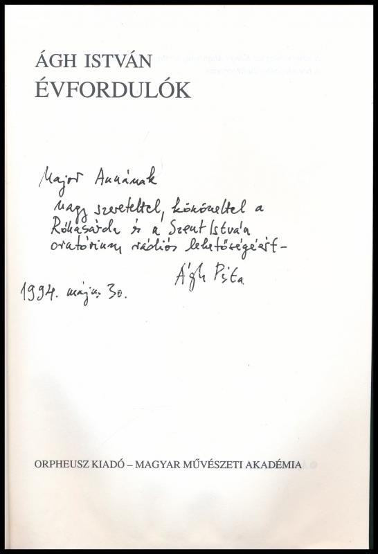 Ágh István: Évfordulók. A szerző által Major Anna (1932-2021) dramaturg,a Szabó - család dramaturgja részére DEDIKÁLT példány. [Bp., 1994.], Orpheusz-Magyar Művészeti Akadémia. Kiadói papírkötés.
