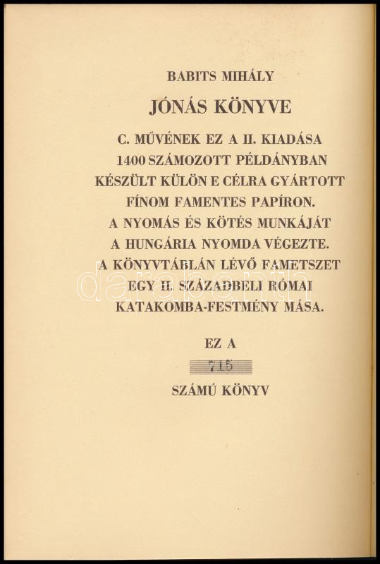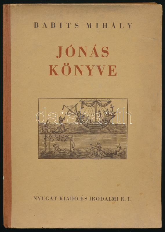 Babits Mihály: Jónás könyve. Bp.,(1941), Nyugat Kiadó és Irodalmi Rt., 20 sztl. lev. Második kiadás. Kiadói félvászon-kötés, kissé kopott, foltos borítóval. Számozott (715./1400) példány.