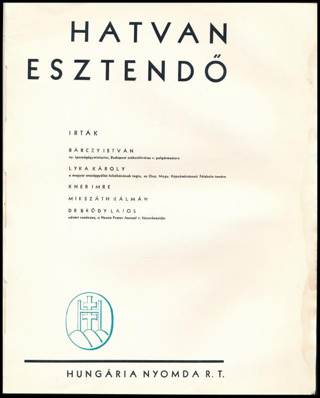Bárczy István - Lyka Károly - Kner Imre - Mikszáth Kálmán - Bródy Lajo... https://www.darabanth.com/de/428-Fernauktion/428.0/Bucher/Bucher-Andere-kuriositaten~1000026/Barczy-Istvan-Lyka-Karoly-Kner-Imre-Mikszath-Kalman-Brody-Lajos-Hatvan-esztendo-1~II2742361