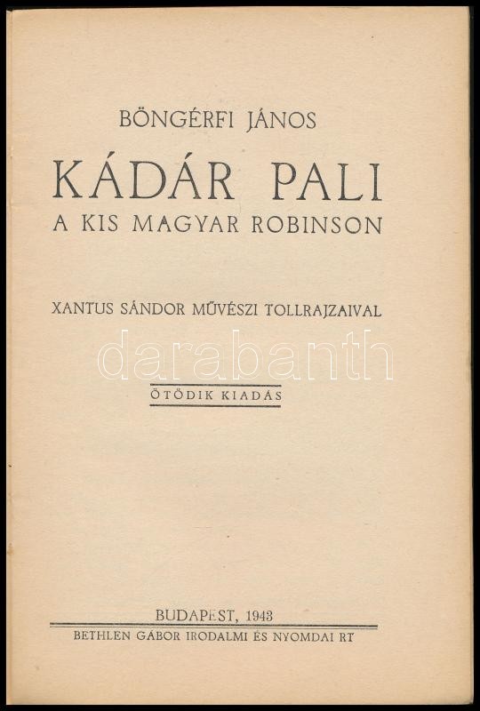 Böngérfi János: Kádár Pali, a kis magyar Robinson. Xantus Sándor művészi tollrajzaival. Bp., 1943, Bethlen Gábor Irodalmi és Nyomdai Rt. Ötödik kiadás. Kiadói papírkötés, sérült, kissé hiányos borítóval és gerinccel.